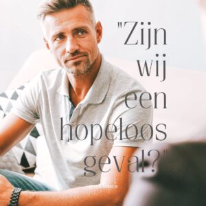 Na een emotionele uitbarsting vroeg een cliënt mij: “zijn wij een hopeloos geval?”. Zijn ogen deels vol spanning maar ook vol verwachting, kijken mij indringend aan. Ik denk vooral “wat kunnen ze nu doen om direct vooruit te komen?”.