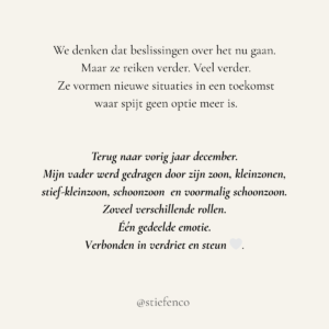 Samen hebben we gelachen, er is gehuild – tranen van verdriet maar ook van geluk – en juist die momenten, hoe klein ook, hebben zoveel betekenis gehad. Een blik, een zachte aanraking, een glimlach die alles zegt: ze herinneren me eraan dat zelfs in de kwetsbaarheid het leven vol schoonheid en verbondenheid blijft.